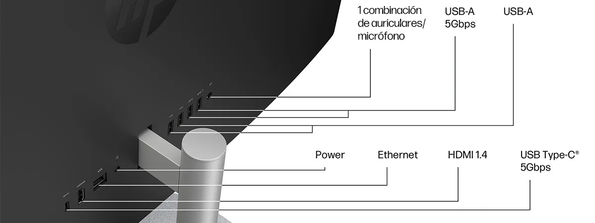 • Puertos: 1 USB Tipo-C® con velocidad de señalización de 5 Gb/s; 2 USB Tipo-A con velocidad de señalización de 5 Gb/s; 2 USB 2.0 Tipo-A; 1 combinación de auriculares y micrófono; 1 RJ-45