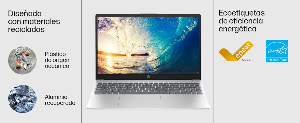La laptop HP de 15,6" viene con múltiples funciones para lograr productividad y para que tu cartera, y el planeta, estén contentos. Fabricada con materiales reciclados, esta potente laptop HP cuenta con un procesador AMD[1], amplio almacenamiento y gráficos fascinantes. Además, su relación pantalla-cuerpo de 85 %[2] y su bisel estrecho de 3 lados ofrecen mucho espacio para hacer y ver más cosas importantes.