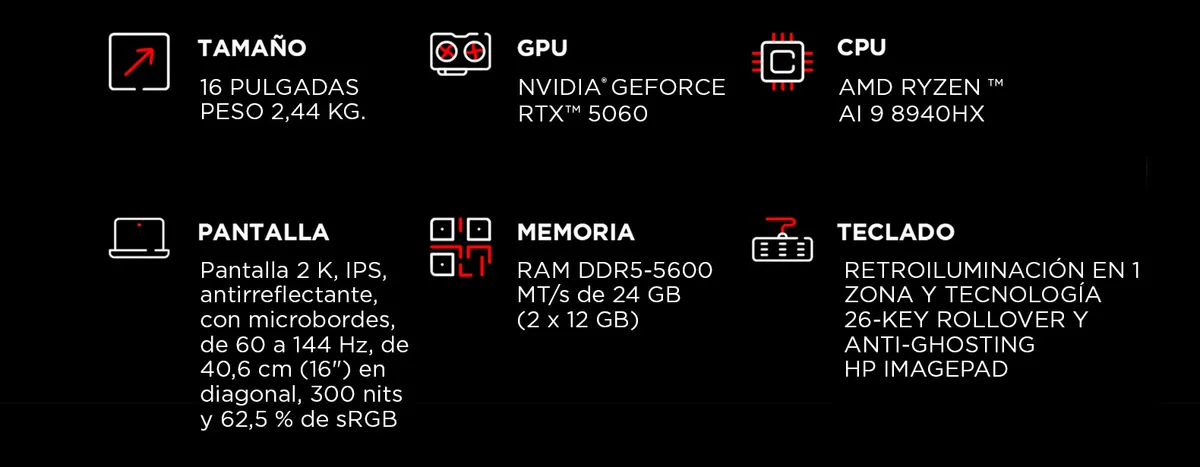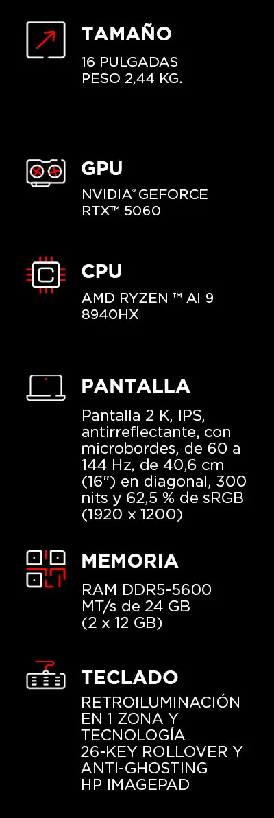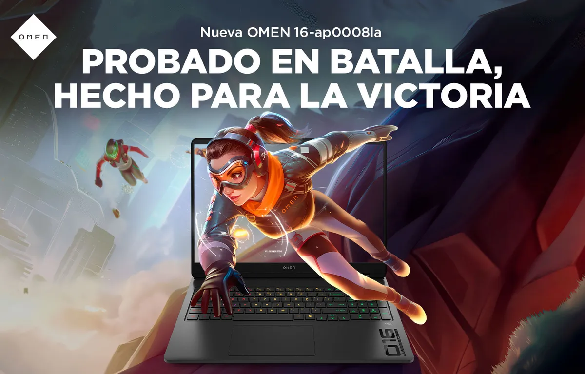 Laptop HP OMEN Gaming 16-ap0008la, AMD Ryzen 9, 24 GB NVIDIA® GEFORCE RTX ™ 5060 GPU portátil (8 GB GDDR7 dedicado), 1 TB SSD, 16, 2K Windows 11 Home