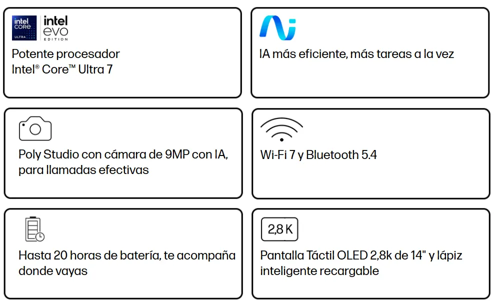 | Tipo procesador | Intel® Core™ Ultra 7 258V (hasta 4,8 GHz con tecnología Intel® Turbo Boost, caché L3 de 12 MB, 8 núcleos, 8 subprocesos) |