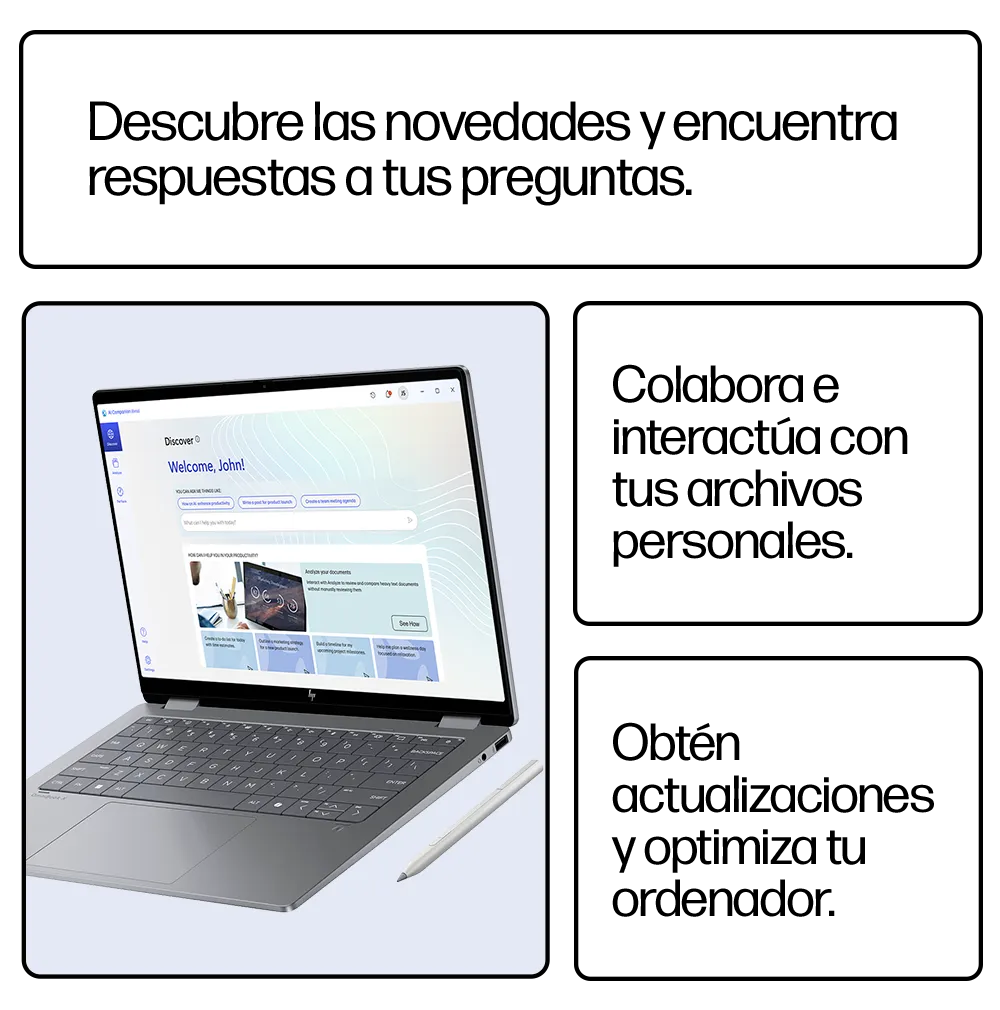 "Nueva HP OmniBook X Flip 14 Next Gen AI PC. Con el lápiz inteligente crea en la pantalla OLED 3K*, rendimiento con 14 horas de duración de batería y seguridad con Windows Hello.