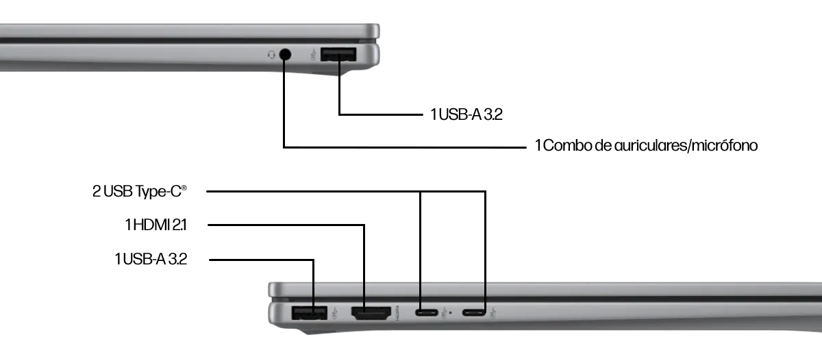 • Puertos: 2 USB tipo-A tasa de señalización de 10 Gbps;1 HDMI 2.1;1 combo de auriculares/micrófono;1 tasa de señalización USB Type-C® 10GBPS (USB Power Delivery 3.1, DisplayPort ™ 2.1, HP Sleep and Charge);1 USB Type-C® 40Gbps Tasa de señalización (USB Power Delivery 3.1, DisplayPort ™ 2.1, HP Sleep and Charge)