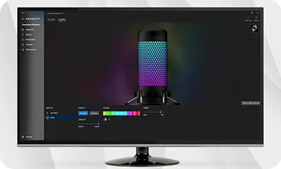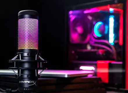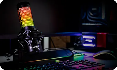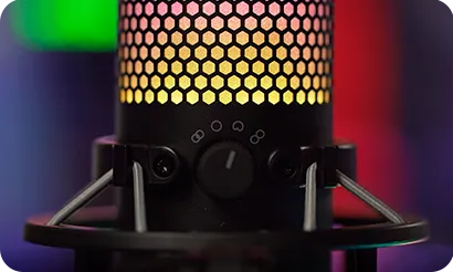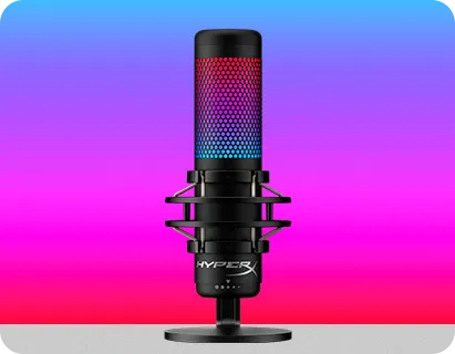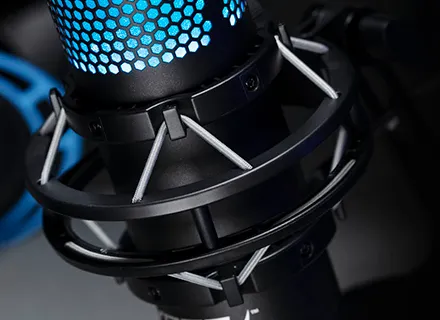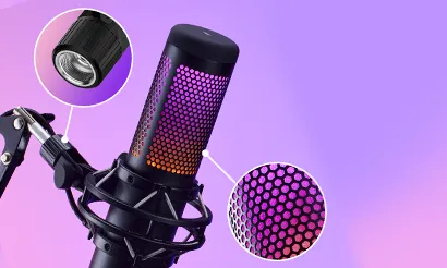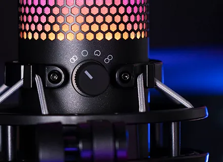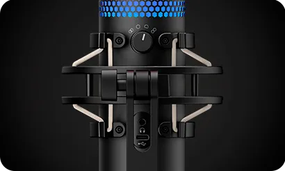 El HyperX QuadCast™ S es un micrófono de condensador USB con excelente sonido y fantástico diseño. La impresionante iluminación RGB personalizable y los efectos dinámicos añaden estilo a cualquier instalación. El QuadCast es un micrófono con todo incluido, que viene con un montaje que no causa vibraciones y un filtro antipop integrado. El indicador LED destaca el estado de su micrófono, y puede simplemente tocar para silenciar para evitar contratiempos en la transmisión. Con cuatro patrones opuestos y un dial de control de volumen, este micrófono está preparado para casi cualquier situación de grabación.